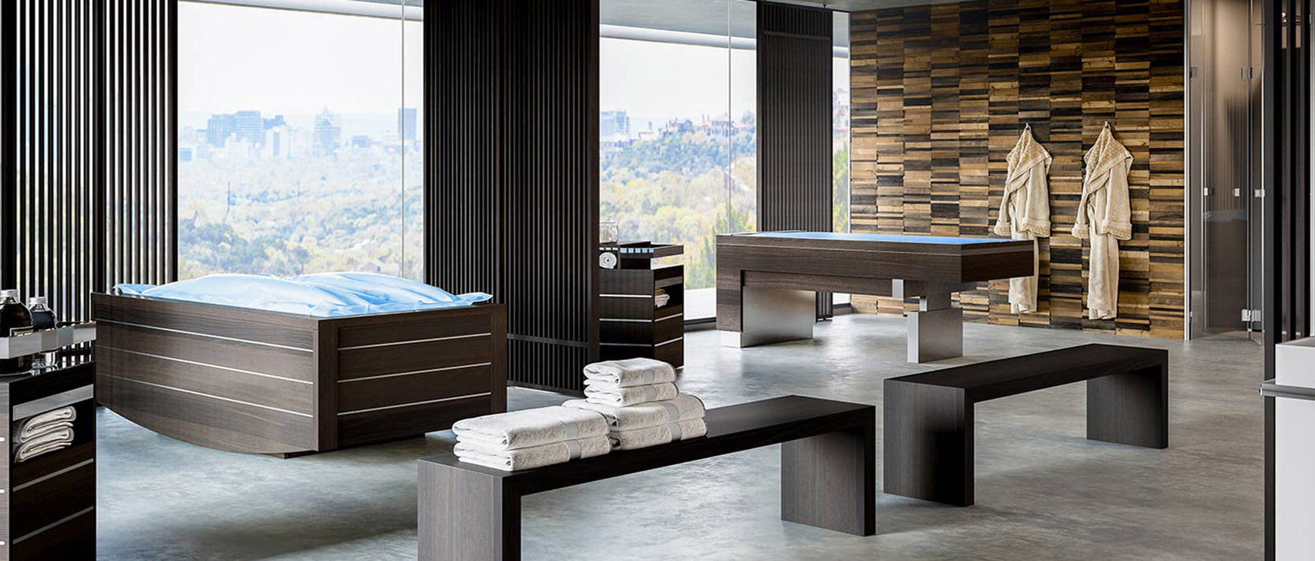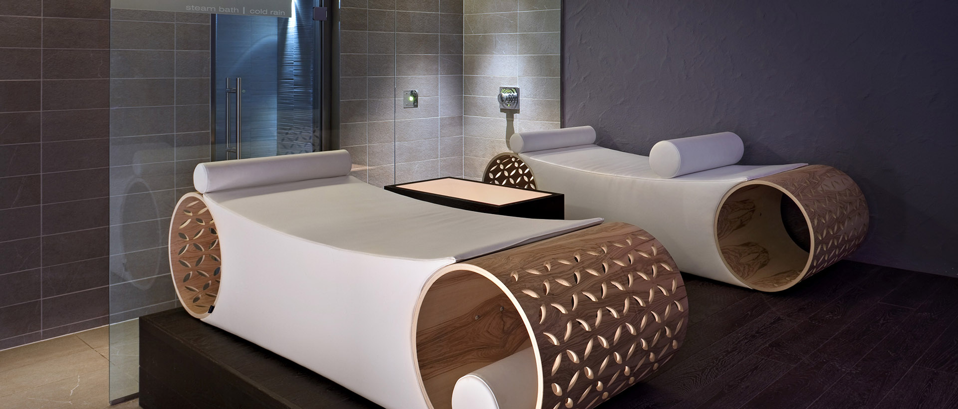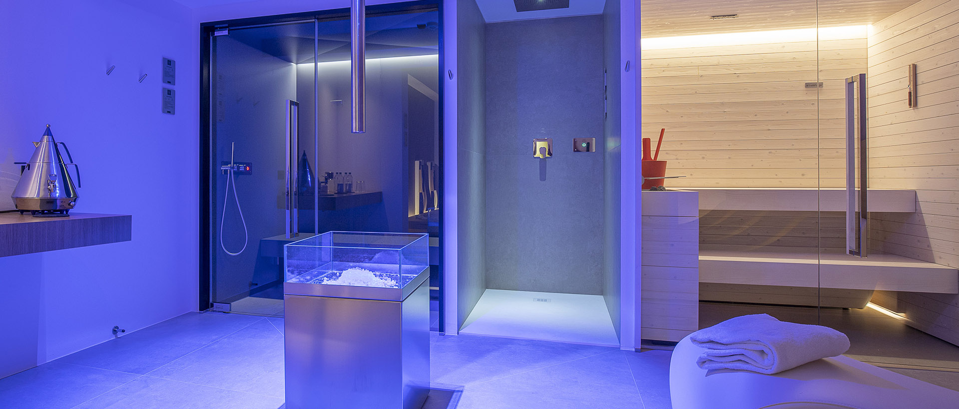 Floating bed, saunas, hammams, bassins inox, bains à remous, douches sensorielles, murs de sel, lits de soins et de massages.